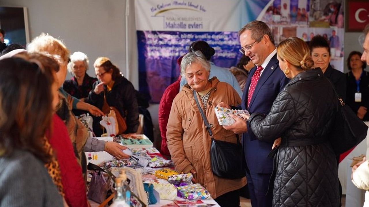 Balıkesir Ayvalık Belediyesi Mahalleevleri'nde kadınların ürettiği el emeği göz nuru eşyalar yılbaşı pazarında satışa çıktı.BALIKESİR (İGFA) - Mahalleevleri çatısı altında kadınların ürettiği birbirinden renkli el emeği göz nuru ürünlerin bulunduğu Yılbaşı Pazarı’nı eşi Canan Ergin ile birlikte ziyaret eden Balıkesir Ayvalık Belediye Başkanı Mesut Ergin, Dr. Fazıl Doğan (At Arabacılar) Meydanı'nda eski Aşevi'nde açılan stantlardan yeni yıl hediyeleri satın aldı.