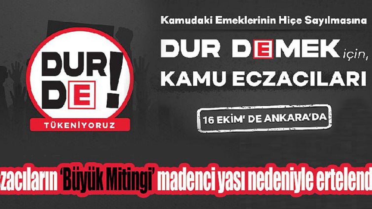 Yaşanan bu elim olay nedeniyle, Türk Eczacıları Birliği ve 54 Bölge Eczacı Odası 16 Ekim Pazar günü Ankara Tandoğan’da düzenlenecek “Büyük Eczacı Mitingi”ni erteleme kararı almıştır.