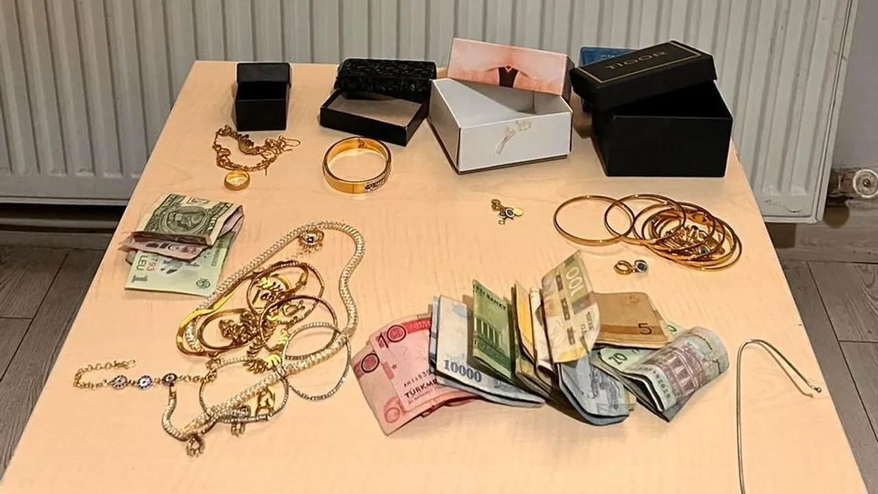 Maymuncuk yardımıyla evin kapısını açan şüpheliler evden 6 adet bilezik, 2 adet taş işlemeli kolye, 6 adet bileklik, 1 adet kelepçe tipi bileklik, “derya” ibareli 1 adet altın kolye, 1 adet altın zincir kolye, 1 adet altın yüzük, 1 adet altın küpe ile farklı ülkelere ait çeşitli miktarlarda koleksiyonluk kâğıt para alarak kaçtı. Ancak kaçış uzun sürmedi.