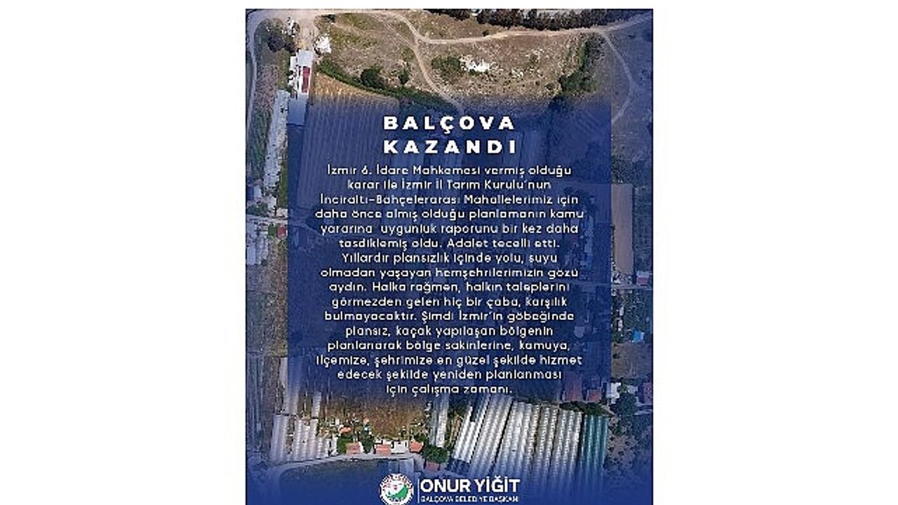 Balçova Belediye Başkanı Onur Yiğit, İzmir 6. İdare Mahkemesi’nin TMMOB Ziraat Mühendisleri Odası Genel Merkezi tarafından açılan davayı reddetmesi üzerine açıklama yaptı.