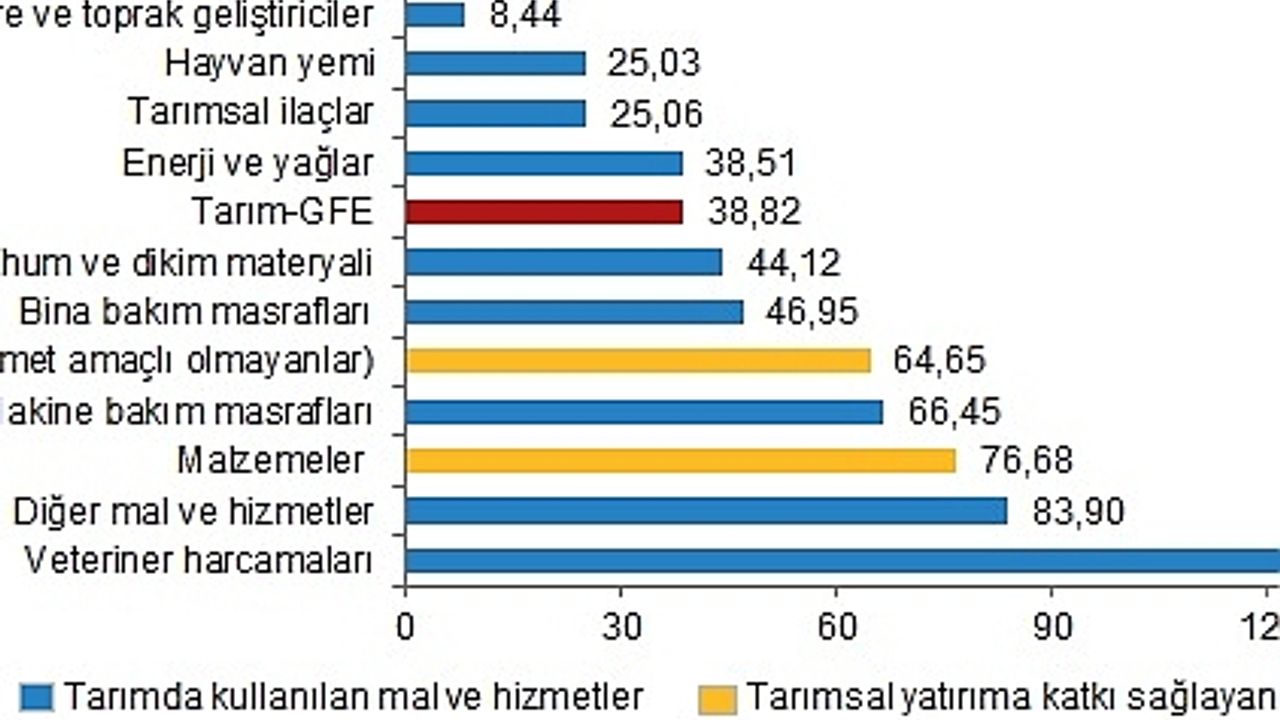 Tarım-GFE'de (2015=100), 2023 yılı Kasım ayında bir önceki aya göre %1,44, bir önceki yılın Aralık ayına göre %37,83, bir önceki yılın aynı ayına göre %38,82 ve on iki aylık ortalamalara göre %46,96 artış gerçekleşti.