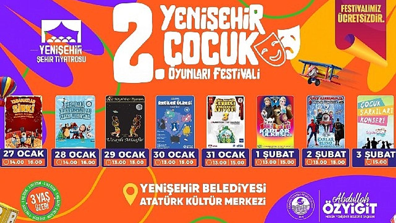 Mersin Yenişehir Belediyesi, çocukların yarıyıl tatilini keyifli geçirmelerini sağlamak ve sanata olan ilgilerini artırmak amacıyla karne hediyesi olarak 8 tiyatro oyununu “2.Yenişehir Çocuk Oyunları Festivali” kapsamında çocuklarla buluşturacak.