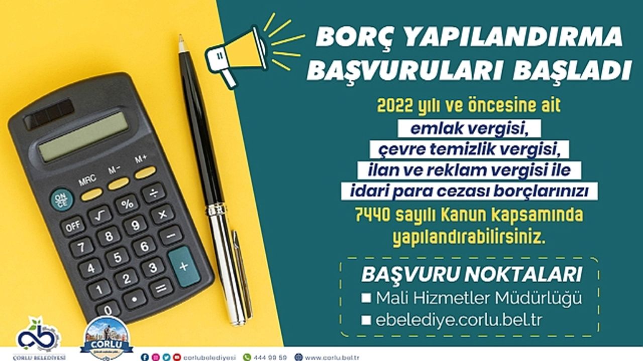 Çorlu Belediyesi’ne olan 7440 sayılı Kanun kapsamındaki 2022 yılı ve öncesine ait emlak vergisi, çevre temizlik vergisi, ilan ve reklam vergisi ile idari para cezası borçlarınızı 31 Mayıs 2023 tarihine kadar yapılandırabilirsiniz.