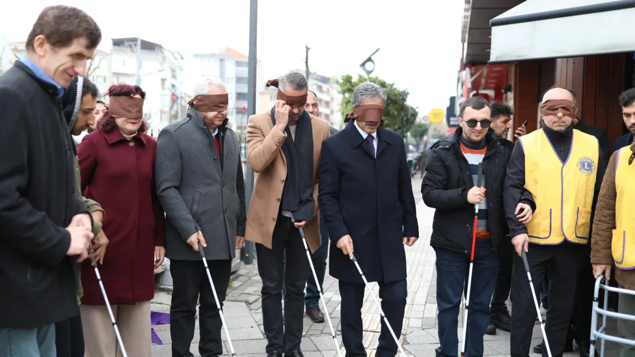 3 Aralık Dünya Engelliler Günü kapsamında, Gemlik Kent Konseyi ve Lions Kulübü işbirliğiyle anlamlı bir farkındalık etkinliği gerçekleştirildi. Etkinlikte, görme engelli bireylerin günlük yaşamda karşılaştıkları zorluklara dikkat çekmek amacıyla empati uygulaması yapıldı.BURSA (İGFA) - Gemlik Belediye Başkanı Şükrü Deviren, Belediye Başkan Yardımcısı Arzu Karataş, CHP Gemlik İlçe Başkanı Servet Pehlivan, Gemlik Kent Konseyi Başkanı Sedat Akkuş ve Gemlik Lions Kulübü yöneticileri, gözlerini bağlayarak görme engelli bastonuyla İstiklal Caddesi’nde karşıdan karşıya geçtiler.