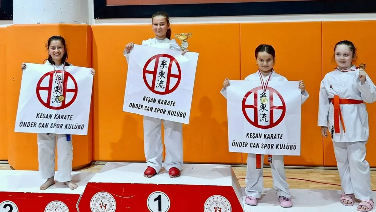 Edirne’de düzenlenen İl Karate Şampiyonası’na Keşan'ı temsilen katılan Önder Can Spor Kulübü sporcuları toplam 5 altın, 4 gümüş ve 7 bronz madalya kazanarak büyük bir başarıya imza attı.Erdoğan DEMİR / EDİRNE (İGFA) - Turnuvaya kata ve kumite branşlarında katılan sporcular, teknik yeterlilikleri, sportmen duruşları ve centilmence mücadeleleriyle dikkat çekti. İl genelindeki kulüplerin katıldığı organizasyonda Keşan Karatecileri, yıl boyunca süren disiplinli çalışmalarının karşılığını kürsüde almayı başardı.