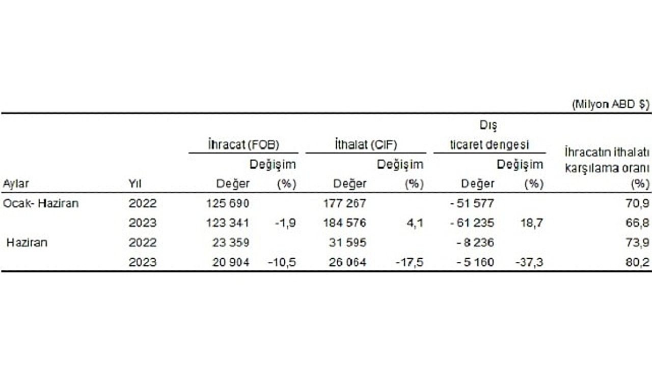Türkiye İstatistik Kurumu ile Ticaret Bakanlığı iş birliğiyle genel ticaret sistemi kapsamında üretilen geçici dış ticaret verilerine göre; ihracat 2023 yılı Haziran ayında, bir önceki yılın aynı ayına göre %10,5 azalarak 20 milyar 904 milyon dolar, ithalat %17,5 azalarak 26 milyar 64 milyon dolar olarak gerçekleşti.