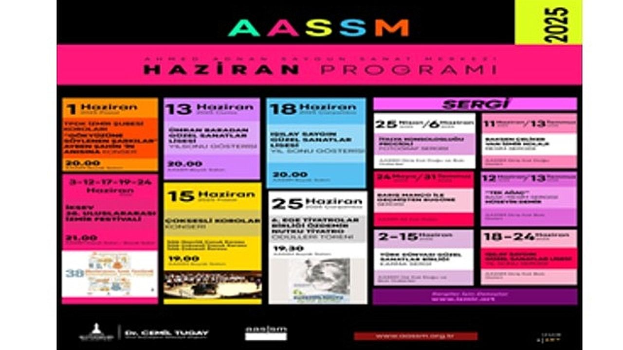 İzmir Büyükşehir Belediyesi Ahmed Adnan Saygun Sanat Merkezi (AASSM), haziran ayında dopdolu bir takvimle İzmirlileri sanatla buluşturmayı sürdürüyor. Müzik, tiyatro ve sergi alanında birbirinden özel etkinliklere ev sahipliği yapan merkez, sanatı herkes için erişilebilir kılmaya devam ediyor.