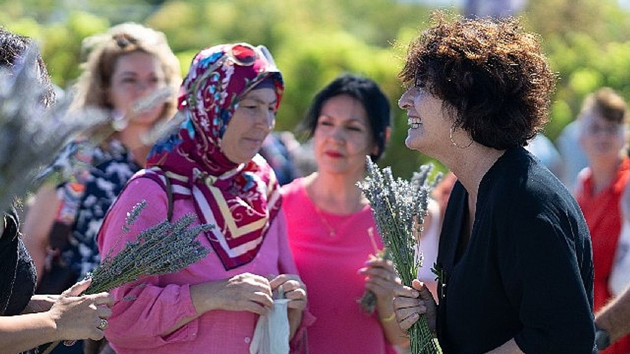 İzmir Büyükşehir Belediyesi, lavanta hasadının son günlerinde üretici eşini kalp krizi sonucu kaybeden Buca Doğancılar Mahalle Muhtarı Nebahat Coşkun için 122 kadın muhtarı bir araya getirdi.