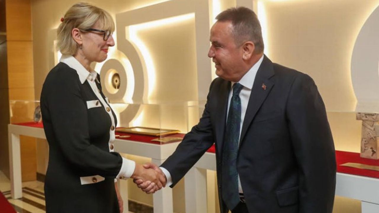 İngiltere Büyükelçisi Jill Morris, Antalya Büyükşehir Belediye Başkanı Muhittin Böcek’i ziyaret etti. Türkiye ile İngiltere arasındaki ilişkilerin ele alındığı görüşmede başta turizm, tarım ve ticaret olmak üzere her alandaki işbirliğinin daha da ileri seviyeye taşınması noktasında yapılabilecekler ele alındı.ANTALYA (İGFA) - Antalya Büyükşehir Belediye Başkanı Muhittin Böcek, Antalya’yı ziyaret eden İngiltere Büyükelçisi Jill Morris’i makamında ağırladı. Büyükelçi Morris’in ziyaretinde Antalya Büyükşehir Belediyesi Genel Sekreteri Cansel Tuncer, Genel Sekreter Yardımcısı Mustafa Gürbüz ile Başkan Danışmanları Osman Ayık ve Lokman Atasoy da hazır bulundu.