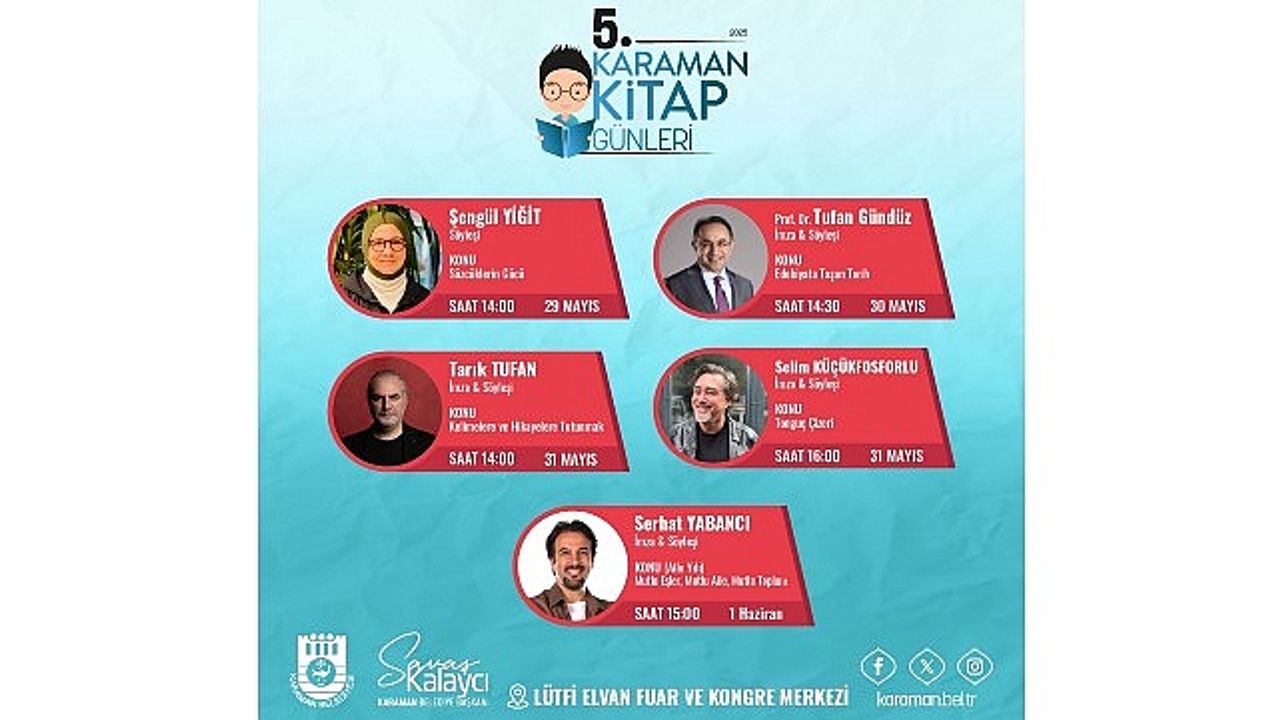 23 Mayıs – 1 Haziran 2025 tarihleri arasında gerçekleşecek Karaman Belediyesi Kitap Günleri her yıl olduğu gibi bu yılda kapılarını okurlarına açıyor.