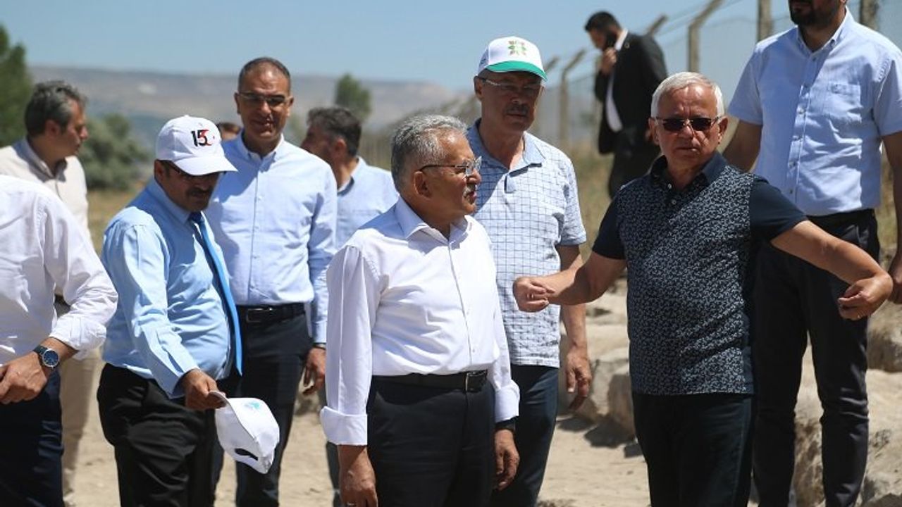 Kayseri Şeker Gölü üzerinde bulunan Selçuklu dönemine ait Keykubadiye Sarayı’nda yapılan kazı çalışmaları tüm hızıyla sürerken, Büyükşehir Belediye Başkanı Dr. Memduh Büyükkılıç, kazı alanında incelemelerde bulundu.