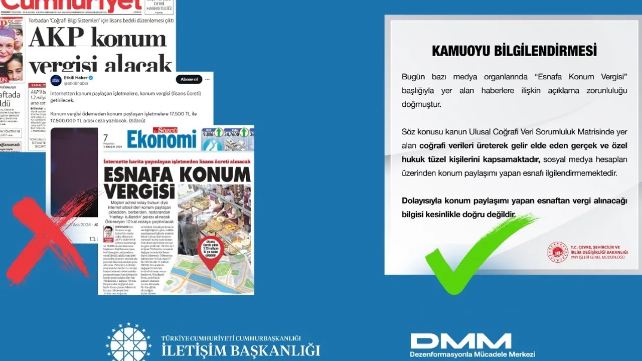 Bazı basın yayın organlarında yer alan ve sosyal medya hesaplarında paylaşılan “Esnafa konum vergisi geliyor” iddialarıyla ilgili açıklama İletişim Başkanlığı'ndan geldi.ANKARA (İGFA) - Dezenformasyonla Mücadele Merkezi, esnafa konum vergisi getirileceği iddialarının kamuoyunu manipüle etmeye yönelik asılsız iddialar olduğunu duyurdu.