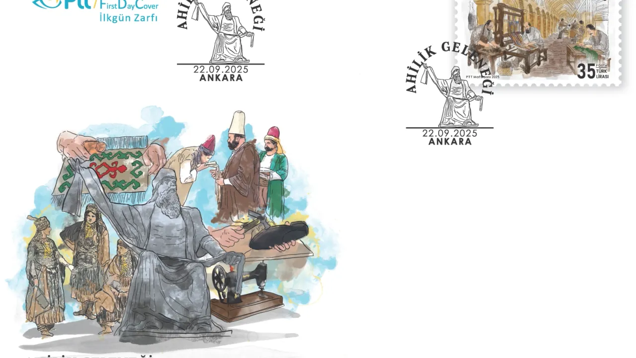 PTT AŞ tarafından “Ahilik Geleneği” konulu anma pulu ve ilkgün zarfı 22 Eylül 2025 tarihinde tedavüle sunuldu.İSTANBUL (İGFA) - PTT AŞ, 22 Eylül 2025 tarihinde "Ahilik Geleneği" konulu 35 TL (36 x 52 mm boyutunda) bedelli anma pulu ile söz konusu pula ait 70 TL bedelli ilkgün zarfını abone sayısı kadar PTT iş yerlerinde ve PTT AŞ’ye ait www.filateli.gov.trweb adresinde satışa sundu.