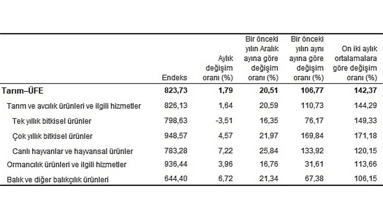 Tarım-ÜFE'de (2015=100), 2023 yılı Mart ayında bir önceki aya göre %1,79, bir önceki yılın Aralık ayına göre %20,51, bir önceki yılın aynı ayına göre %106,77 ve on iki aylık ortalamalara göre %142,37 artış gerçekleşti.