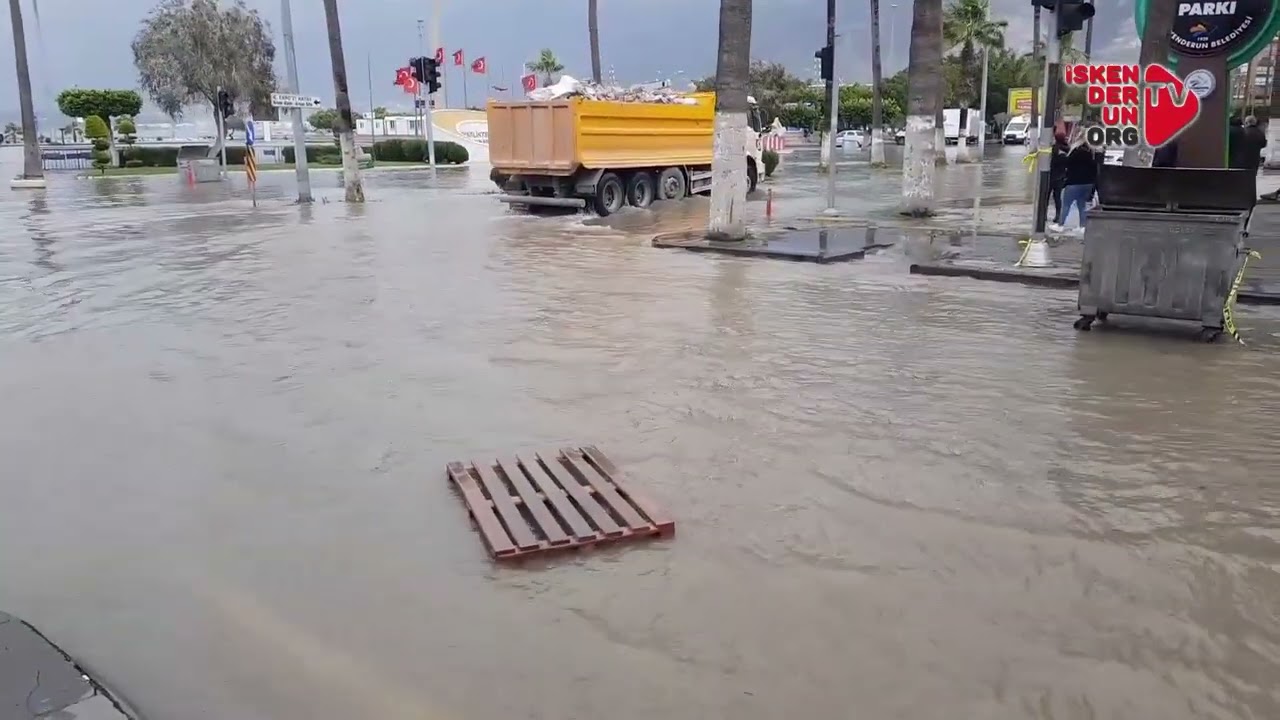 Yağış ve fırtınanın bugün yine sahil kesimini sular altında bıraktığı İskenderun Atatürk Bulvarı, Anıt alanı, Mareşal Çakmak Caddesi, Mete Aslan Bulvarına kadar su taşkını ulaştı, birçok esnafın iş yerini su...